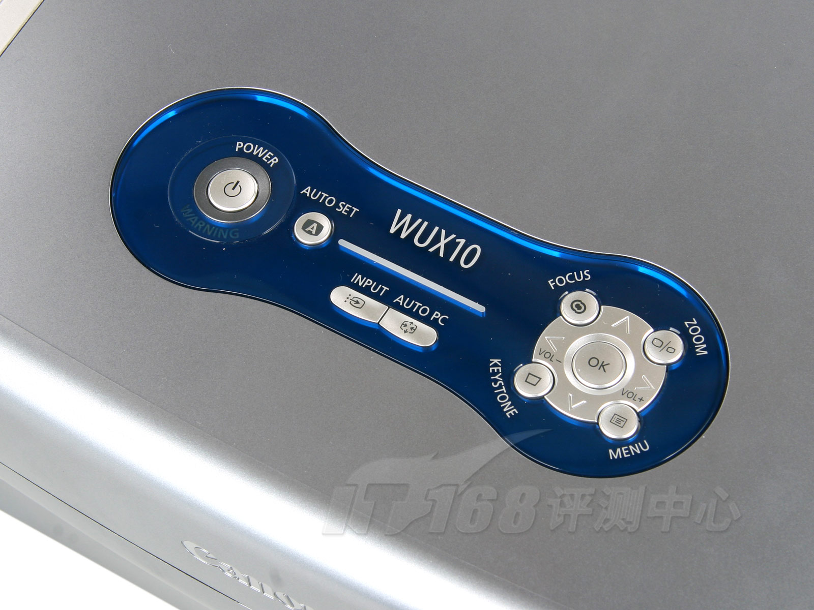 机身按键功能相当齐全,操作起来也很顺手,值得一提的是WUX10上的AUTO SET按键,按下后投影机即可自动设定四种主要设置,包括自动对焦,自动梯形校正,自动信号输入,自动屏幕色彩修正。有了这个方便的功能,即使无经验的操作员也可得到一个理想的放映设置。遥控器为夜光型,虽不带背光,但在黑暗环境下也可以看到按键,进行操作。