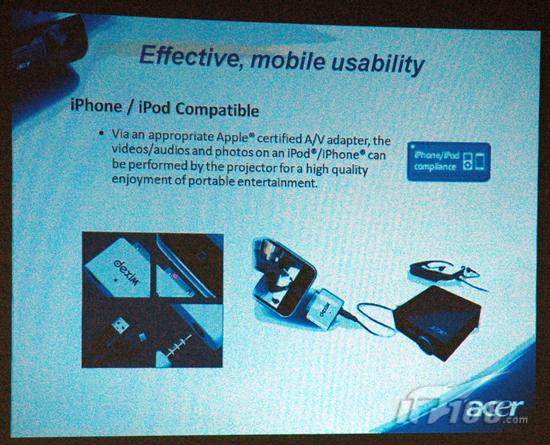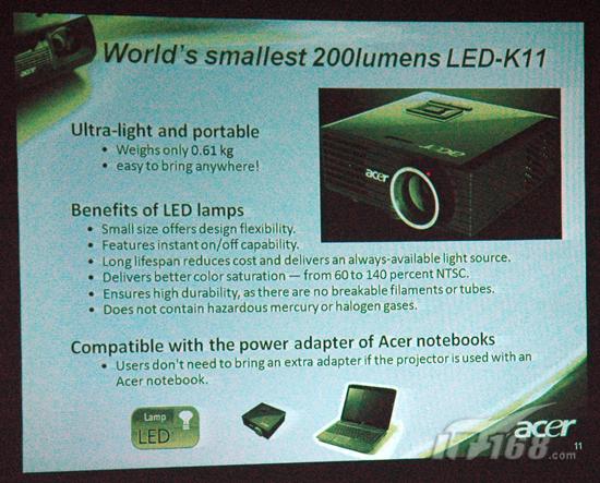 要想达到如此之高的增长,引人注目的新品自然必不可少,在这方面,2010年Acer投影机将会发布包括3D、入门级1080p、超短焦以及便携LED等机型,归纳总结起来可以称为专业级、便携级、超值级和家用级,全面抢占投影市场。刘巍先生首先介绍了全球最小的200流明LED机型K11,这款即将于5月上市的机型光源寿命可以很轻松的达到20000小时以上,而且只有0.61kg。更加引人注目的是,K11还附带一个可连接iPhone或Touch的连接线,直接投射出画面。