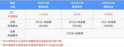 通过上表不难发现,NEC原厂光源翻新的性价比很高。参照使用时长,设备提升亮度后持续运行24000小时(约6年),NEC原厂光源翻新的费用仅7.5万元,相比时租或买断的激光改造方式节省了3.5-4.5万元。
