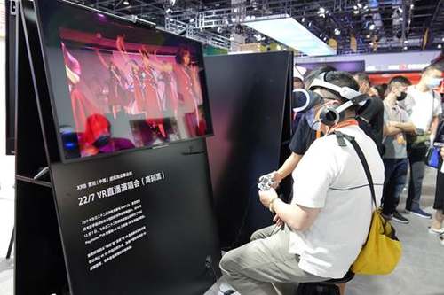 由索尼(中国)XRB虚拟现实事业部带来的基于索尼VR(虚拟现实)技术的4K 3D三视角VR演唱会直播、虚拟偶像VR互动剧场等科技娱乐解决方案也首次在华亮相,观众可以通过展台设置的多个VR头盔与手柄自由移动视角和位置近距离与偶像接触, 仿佛置身现场一般欣赏由七分之二十二、Pinky Pop Hepburn、辉夜月带来的精彩歌舞表演,也可以叫上好友一起来VR中互动体验。