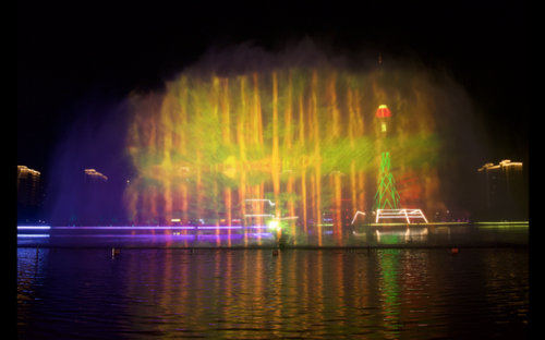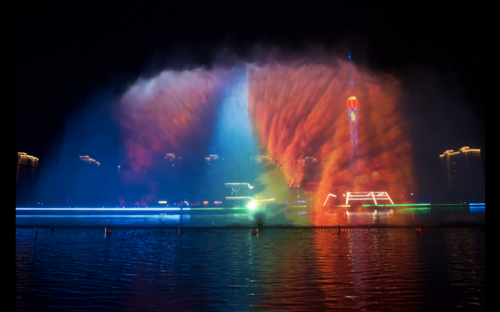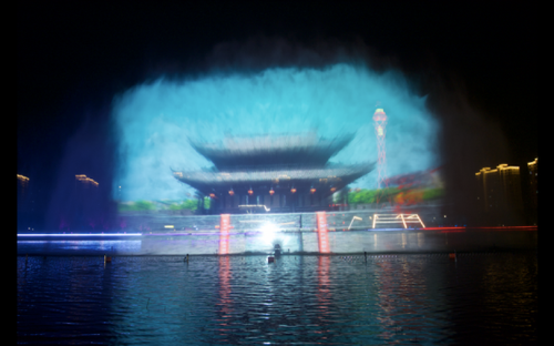 夜游昭阳湖公园的另一大看点当属湖中央的喷泉水幕。使用高压水泵和独特喷头将水高速喷出并快速雾化,在空中呈现约1000平方米的银幕效果,再依托1台NEC旗舰级双色激光工程投影机,将人文初祖、楚韵遗风、垛城记忆、湖荡传说等当地文化投射到水幕上,打造炫酷的沉浸式体验,吸引入园游览的市民驻足观看。