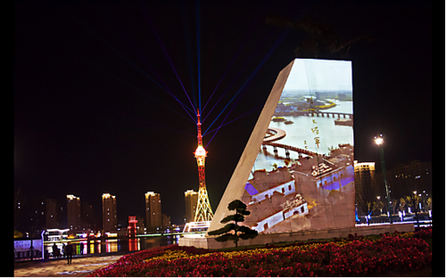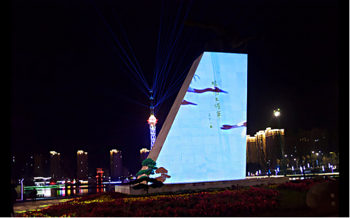 位于西侧公园主入口广场的昭阳大将军雕塑碑是公园的主要景观,也是兴化的标志性建筑。驾马奋蹄、持弓劲射,以往,市民只能通过静态的雕塑形象感受到昭阳将军的英勇之姿;如今,采用1台NEC哈勃系列液晶激光投影机PA804UL(8000流明、WUXGA)打造的将军碑投影秀不仅让将军“力拔山兮气盖世”的骑射雄姿变得鲜活起来,更通过投影技术,让科技和人文相融合,再现兴化发展的古往今来。