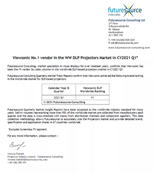 【IT168 资讯】近日,世界权威独立调查机构——未来资源咨询公司(FutureSource)的季度市场跟踪报告公布,优派(ViewSonic)位列2021年度第一季度全球DLP投影销量榜单第一。各项分析数据显示优派凭借应用创新与多元、智能的产品,在全球DLP投影机市场中增长强劲,2021年第一季度领跑同业市场。