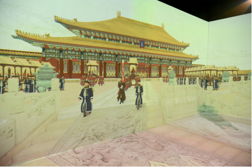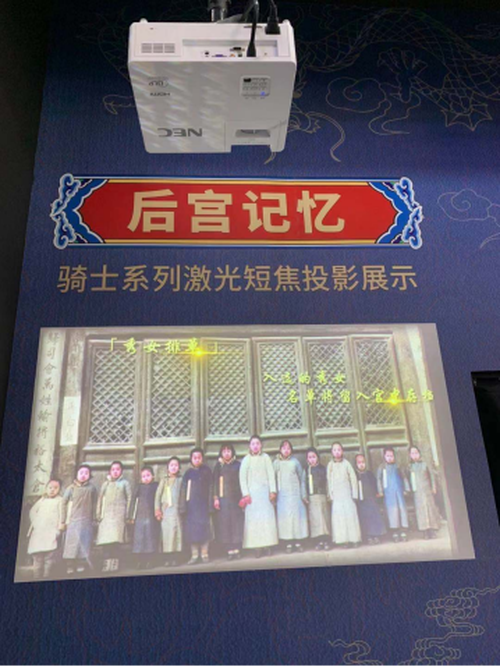 移步出口处,由NEC骑士系列激光短焦投影机CS3300HL(3500流明、Full HD、0.5短焦投射比)带来的“后宫记忆”展项,通过一张张老照片揭秘清朝后宫选秀女的真实过程,让观众遥想那些后宫女眷的历史故事。