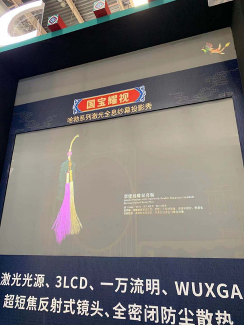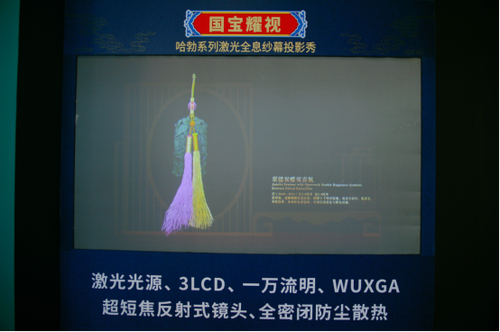 来到NEC展位,喜庆吉祥和盛大美好的气息迎面而来。由NEC绿洲系列激光投影机PX1005QL-B+(10000流明、4K分辨率、激光光源)搭配0.37反射式超短焦镜头及OPS一体化解决方案打造的“锦绣良辰”展项首先映入眼帘,通过“宫囍龙凤呈祥”先导片的播放,让观众对中华民族的婚俗文化及清朝皇帝大婚礼仪有一个整体清晰的认知。