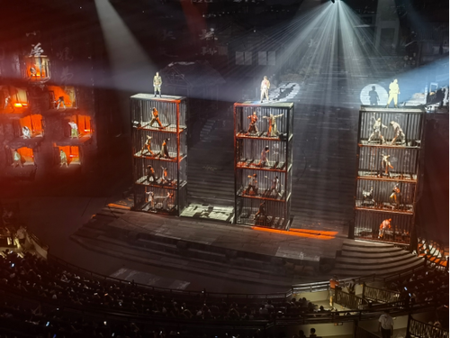 “重庆·1949大剧院”是为《重庆·1949》剧目量身定制的大型非标实景式剧院,总建筑面积达2.5万平方米,是目前世界上最大的单一室内动态沉浸式表演剧场。其颠覆性创新,向观众呈现了前所未见的多维立体沉浸式室内动态舞台。整个舞台由5个可360度旋转的圆环组成,其中1、2、3环为核心表演及布景区域,4、5环既是舞台也是观众席,演艺空间与观演空间交相穿插,随着剧情的发展而不断变换视角位置,使观众与演出完全融为一体,从而营造出身临其境、如梦如幻的独特观演场景体验。
