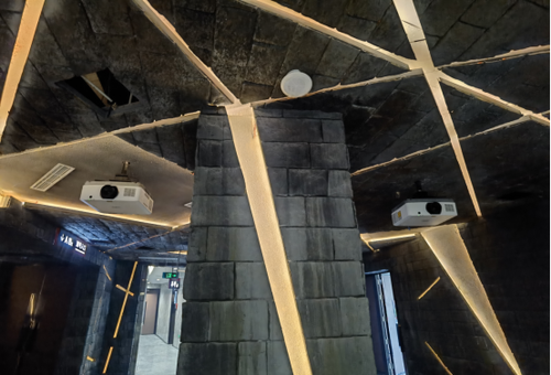 在观众入口处,6台NEC高端激光工程液晶投影机PA703UL+(7000流明、WUXGA分辨率)分别通过雾幕投影和地面投影的方式对实景剧海报内容予以创意展现,吸引观众眼球。其中4台PA703UL+通过两两融合的方式,创新性地打造了两块雾屏,带给观众亦真亦幻的立体视觉享受。当观众穿越雾屏进场时,仿佛跨越时空,穿越回了那座黎明前的“山城”,去领略那段满含悲壮而又令人肃然起敬的历史。PA703UL+拥有REC.2020广色域,令雾屏的色彩表现绚丽多彩;2500000:1的超高对比度,使得画面层次感更强烈,视觉感受更具冲击力和立体感。