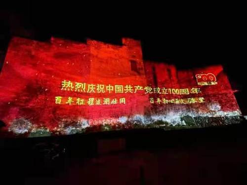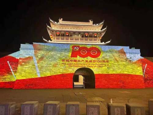 6台NEC双色激光工程投影机英雄系列PX2000UL+(20000流明、DLP激光、WUXGA分辨率)将千年古镇杭州建德梅城镇的澄清门北城墙点亮,通过电光流影、如梦似幻的3D裸眼灯光秀演绎建党史诗,表现革命先辈在梅城留下的革命痕迹,以时间线的方式体现中共建德党组织沿革,庄严的红色调背景凸显金色标题,共同庆祝建党100周年。