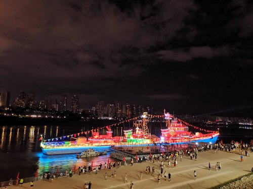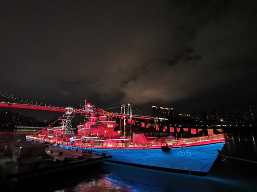 夜幕降临,在九龙坡建设码头,流光溢彩的166舰和鹅公岩大桥交相辉映,染红了涛涛长江,这是由退役的海军珠海舰(166舰)改建的166舰陈列展。由NEC英雄系列双色激光工程投影机PX2000UL+(20000流明、DLP激光、WUXGA分辨率)打造的166舰“庆祝建党百年主题灯光秀”,以中国红致敬英雄舰艇,歌颂伟大的共产党。