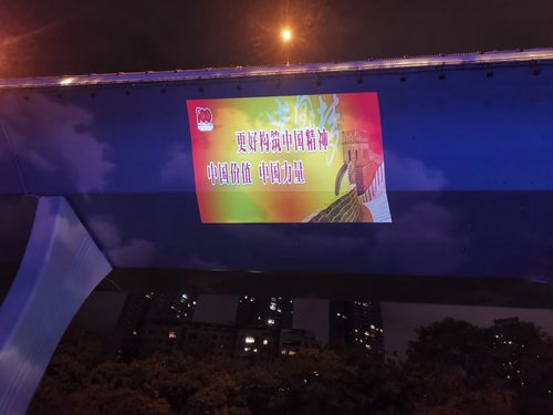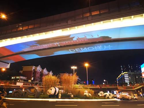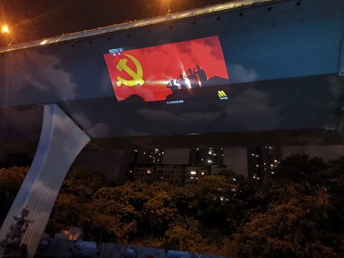 夜幕下的成都,多个地标开启盛大灯光秀。位于成都市成华区的一环路府青立交,由7台NEC英雄系列双色激光工程投影机PX2000UL+(20000流明、DLP激光、WUXGA分辨率)点亮,变成一块长58米,宽约13米,成像面积超过750平方米的巨大成像屏幕,对党的百年光辉历程精彩回望。在英雄系列的精彩演绎下,立交桥旧貌换新颜,红旗招展,万山红遍,各种红色元素传递着人们对党的拥护和热爱,对美好生活的向往和追求。