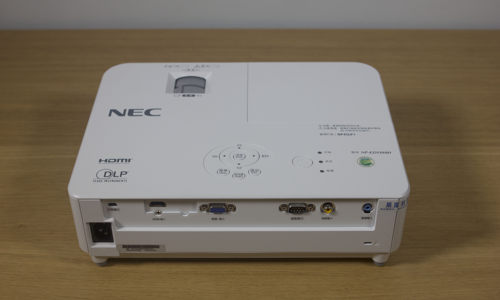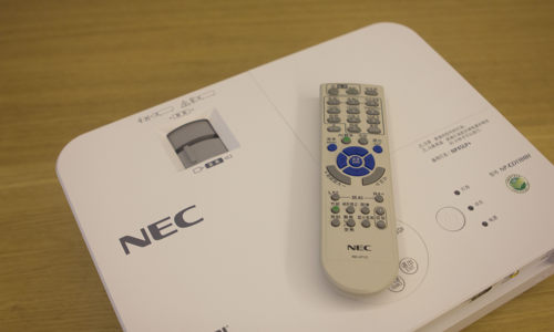NEC CD1100H家用投影机的控制按键部分,设计在了机身的正面,用户可以根据实际使用需求进行调节。此外,为了配合用户吊装使用,该机还附带了遥控器,方便用户的使用。