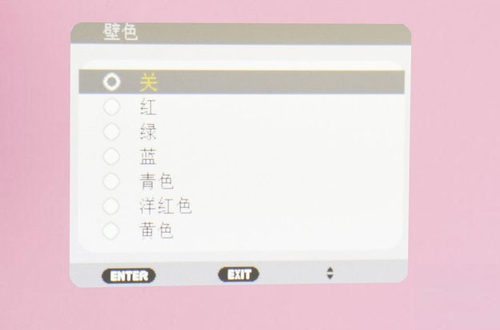 此次值得一提的是,NEC在 CD1100H家用投影机上,提供了背景色校正功能。即投影机内置了应对不同颜色墙面的颜色校正补偿数据,也就是说可以在不同颜色的墙面上,显示出接近幕布上的投影效果,而可供选择的6种壁色包括: 红色、绿色、蓝色、青色、洋红色、黄色。