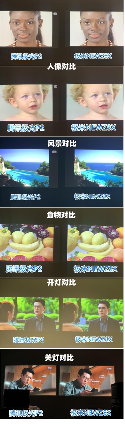 为了检测投影仪在使用中对人脸肤色的正确性,我也进行了两款产品的人像测试,通过肤色对比图可以看出极米NEWZ8X的画质颜色偏冷色,而腾讯极光投影P2投出的儿童肤色较为接近原色,在长时间的使用下整体感受更为自然舒适。除此之外,腾讯极光投影仪P2 还支持8K解码 特有的8K专区,更能在视觉上满足你的所有想象。