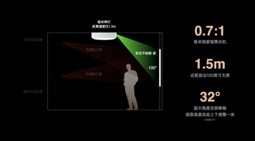 得益于吸顶灯在家中卧室C位的特性,极米光学团队为极米神灯研发并制造了专用光机。与其他短焦/超短焦投影不同,极米神灯拥有32°超大角度的无损移轴,以100英寸画面为例,可以自由的将画面高度上下调整1米的范围:用户可以尽情的降低画面高度,在床上获得一个几乎平视的画面;可以将画面适当的升高,让好奇的小朋友即使贴着墙面跳动,也不会进入画面光线范围内。所以,极米神灯可能是最安全的家用投影,它从物理空间设计上,最大程度地避免了射眼风险。不论是小孩还是家里的宠物,都不必再担心会被投影光线刺入眼睛。