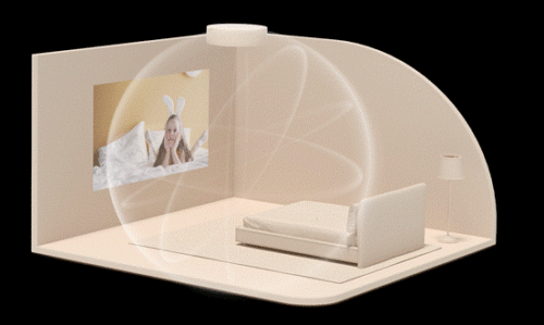 为了实现音画合一,极米采集了大量国内住宅的空间数据,并同时打造了斜角、扇形角开孔等数十款样机,通过多个房间的模拟测试,最终设计出了这套利用墙面发声的音响。极米神灯的音响系统依托计算音频,按照模拟出的特定角度发出声波,利用声波反射的原理,以投影画面的墙面作为发声源,从而实现音画合一的效果。同时,搭配极米神灯首次加入的独立低音单元,使其可以在房间内轻松营造出360°环绕的声场效果。
